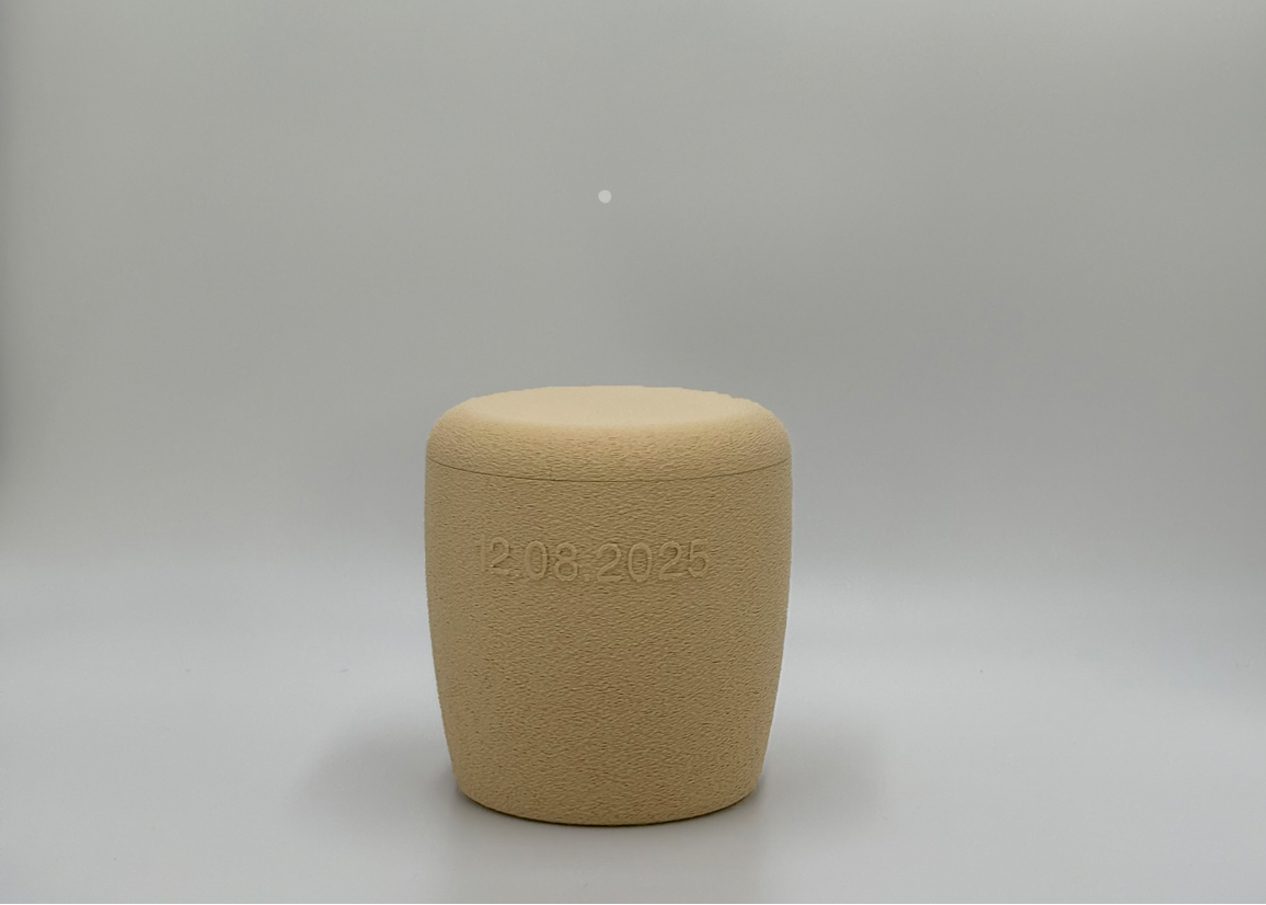 Diese Urne wird im modernen 3D-Druckverfahren aus umveltfreundlichem PLA-Material hergestellt. Der 3D-Druck ermöglicht präzise Formen, individuelle Designs und eine ressourcenschonende Production mit minimalem Abfall. Kleine Oberflächenunregelmäßigkeiten können durch die Schicht-für-Schicht-Technologie entstehen und sind völlig normal - sie machen jedes Stück einzigartig.